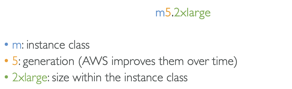 - 2xlarge : 인스턴스 클래스 내에서 크기. small, large, 2xlarge, 4xlarge 등. 크기가 클수록 인스턴스에 더 많은 메모리와 CPU를 가지게 됨.