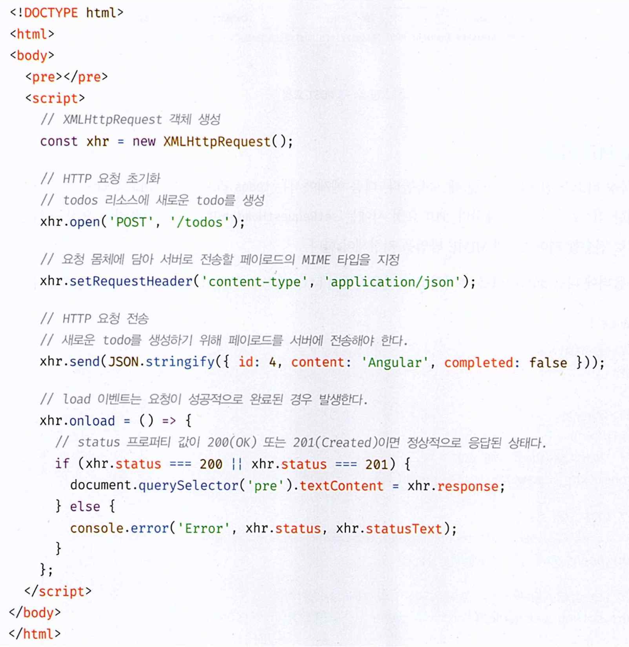 POST 요청 시에는 setRequestHeader 메서드를 사용하여 요청 몸체에 담아 서버로 전송할 페이로드의 MIME 타입을 지정해야 한다.