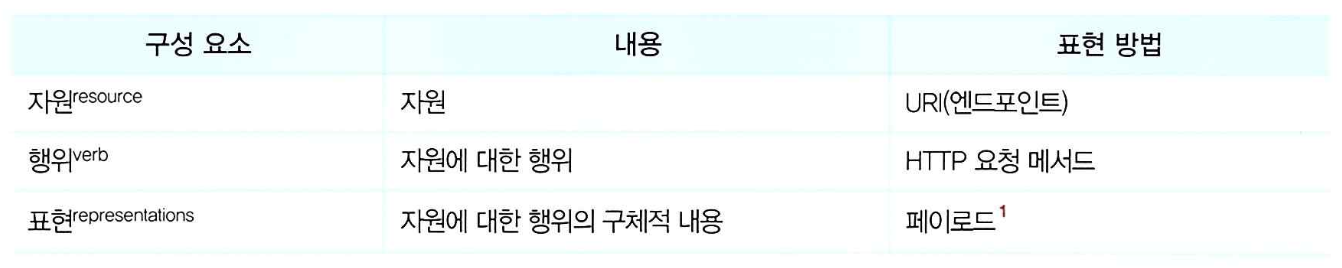 REST API는 자원(resource), 행위(verb), 표현(representations)의 3가지 요소로 구성됨.
