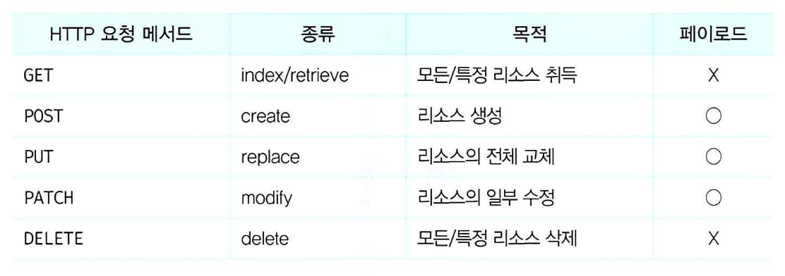 주로 5가지 요청 메서드(GET, POST, PUT, PATCH, DELETE 등)를사용하여 CRUD를구현한다.