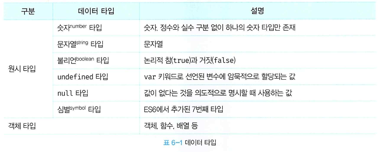 자바스크립트(ES6)는 7개의 데이터 타입을 제공한다.