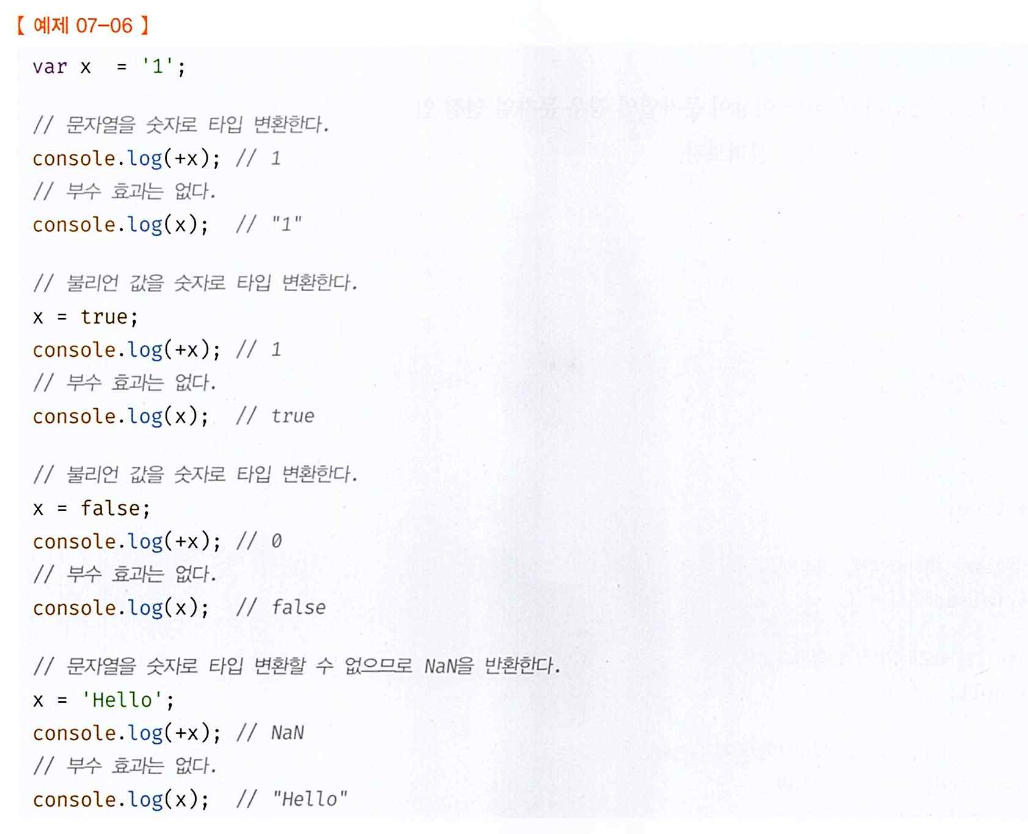 ( 이때 피연산자를 변경하는 것은 아니고 숫자타입으로 변환한 값을 생성해서 반환한다. 따라서 부수효과는 없다.)