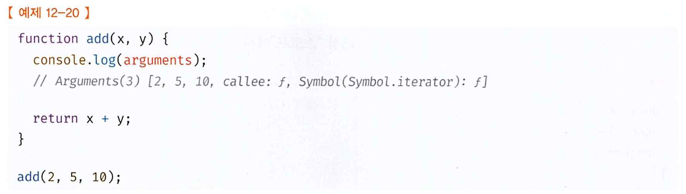 다만 초과된 인수가 그냥 버려지는 것은 아니고 모든 인수는 암묵적으로 arguments 객체의 프로퍼티로 보관된다.