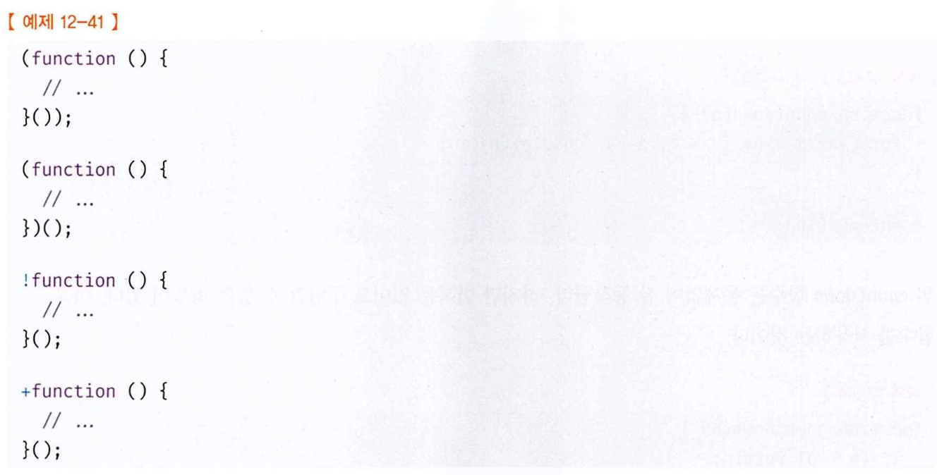 그룹 연산자(...)로 감싸고 끝에 ()를 추가한 함수단 한 번만 호출되며 다시 호출할 수 없음. (그룹 연산자 내에서는 함수 리터럴로 평가되며 함수 이름이 몸체에서만 참조할 수 있는 식별자이므로)