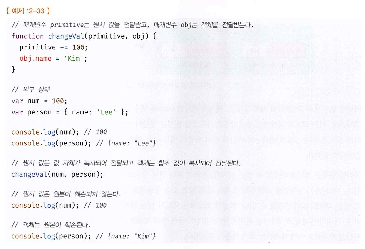 위 코드에서 보는 것과 같이 원시 값은 값이 훼손되지 않고, 객체값은 참조에 의한 전달을 하므로 함수 내에서 바꾸면 원본 값도 변경된다.