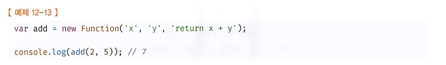 자바스크립트가 기본 제공하는 빌트인 함수인 Function 생성자 함수에 매개변수 목록과 함수 몸쳬를 문자열로 전달하면서 new 연산자와함께 호출하면 함수 객체를 생성해서 반환
