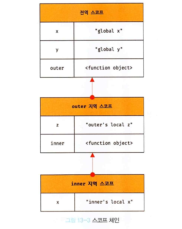 이렇게 스코프가 계층적으로 연결된 것을 스코프 체인이라 한다.