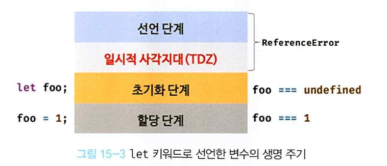 스코프의 시작지점부터 초기화 시작지점까지 변수를 참조할 수 없는 구간을 일시적 사각지대TemporalDead Zone;TDZ라고 부른다.