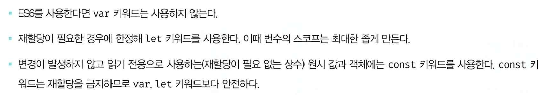 - let : 재할당이 필요한 경우 한정해 사용하는 것이 좋음(const 키워드를 사용하면 의도치 않은 재할당을 방지하기 때문에 좀 더 안전)