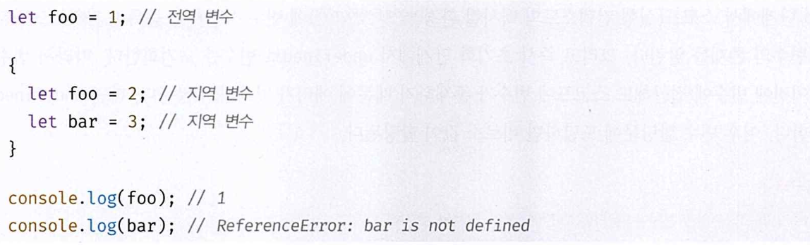 위 코드에서 전역에서 선언된 foo 변수와 코드 블록 내에서 선언된 foo 변수는 다른 별개의 변수이다.