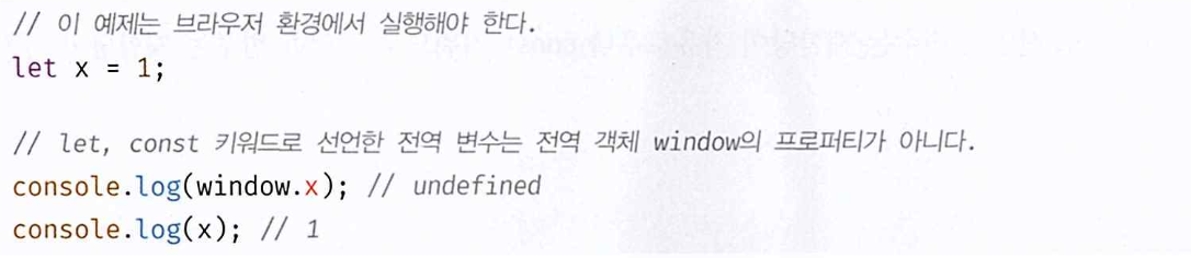 var 키워드로 선언한 전역변수와 전역함수, 그리고 선언하지 않은 변수에 값을 할당한 암묵적 전역은 전역 객체 window의 프로퍼티가 된다. 전역 객체의 프로퍼티를 참조할때 window를 생략할 수 있다. 하지만 let 키워드로 선언한 전역 변수는 전역 객체의 프로퍼티가 아니므로 window. 를 사용하여 접근 할 수 없다.