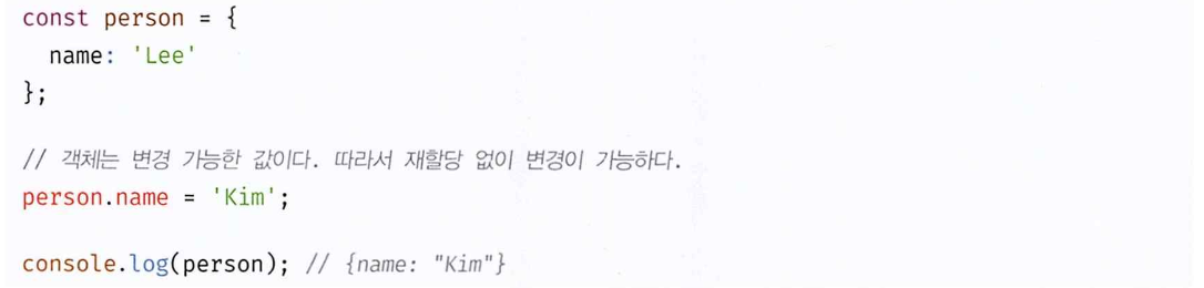 하지만 const 키워드로 선언된 변수에객체를 할당한 경우 값을 변경할 수 있다.