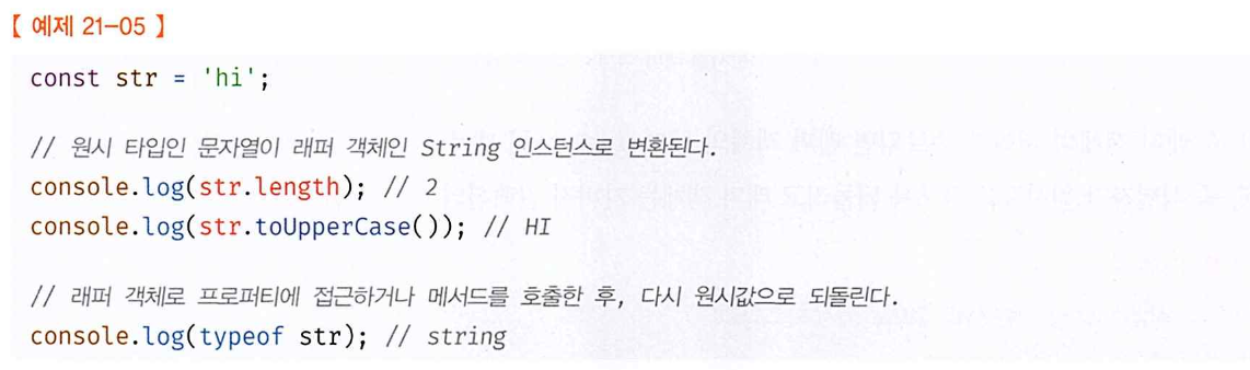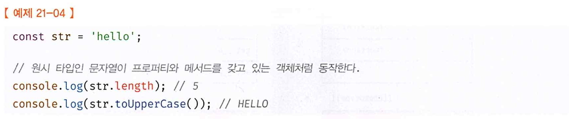 이처럼 문자열, 숫자, 불리언, 심벌은 암묵적으로 생성되는 래퍼 객쳬에 의해 마치 객체처럼 사용할 수 있으며, 표준 빌트인 객체인 String, Number, Boolean, Symbol의 프로토타입 메서드 또는 프로퍼티를 참조할 수 있다.