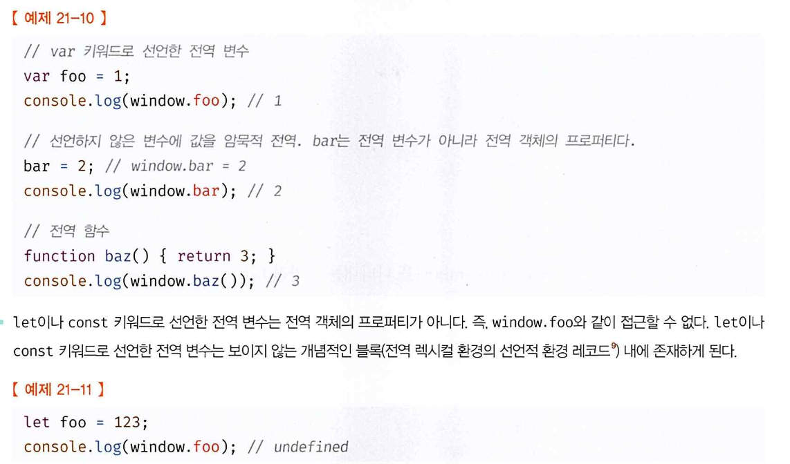 코드가 실행되기 이전 단계에 자바스크립트 엔진에 의해 어떤 객체보다도 먼저 섕성되는 특수한 객체이며, 어떤 객체에도 속하지 않은 최상위 객체