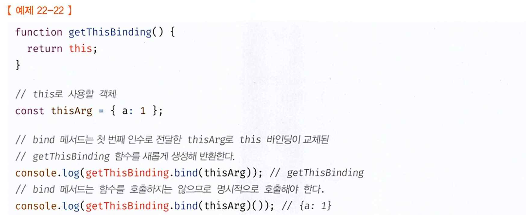 bind 메서드는 위 두 메서드와 달리 함수를 호출하지 않는다. 다만 첫 번째 인수로 전달한 값으로 this 바인딩이 교체된 함수를 새롭게 생성해 반환한다.