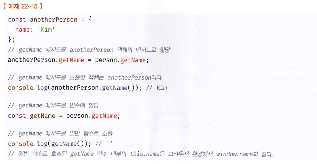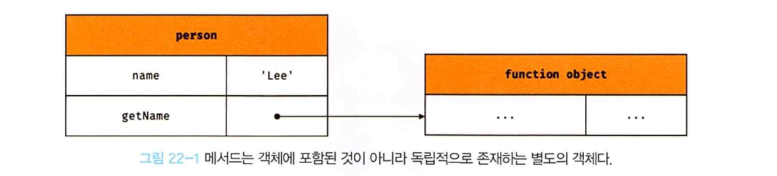 따라서 getName 프로퍼티가 가리키는 함수 객체, 즉 getName 메서드는 다른 객체의 프로퍼티에 할당하는 것으로 다른 객체의 메서드가될수도 있고 일반 변수에 할당하여 일반함수로 호출될 수도 있다.