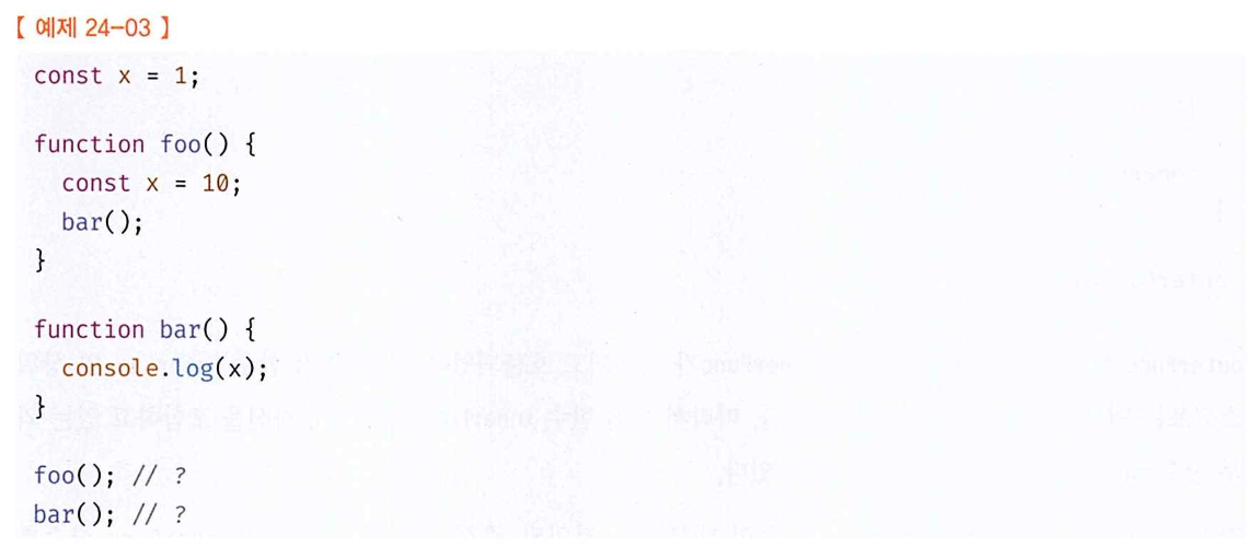 자바스크립트 엔진은 함수를 어디서 호출했는지가 아니라 함수를 어디에 정의했는지에 따라 상위 스코프를 결정하며