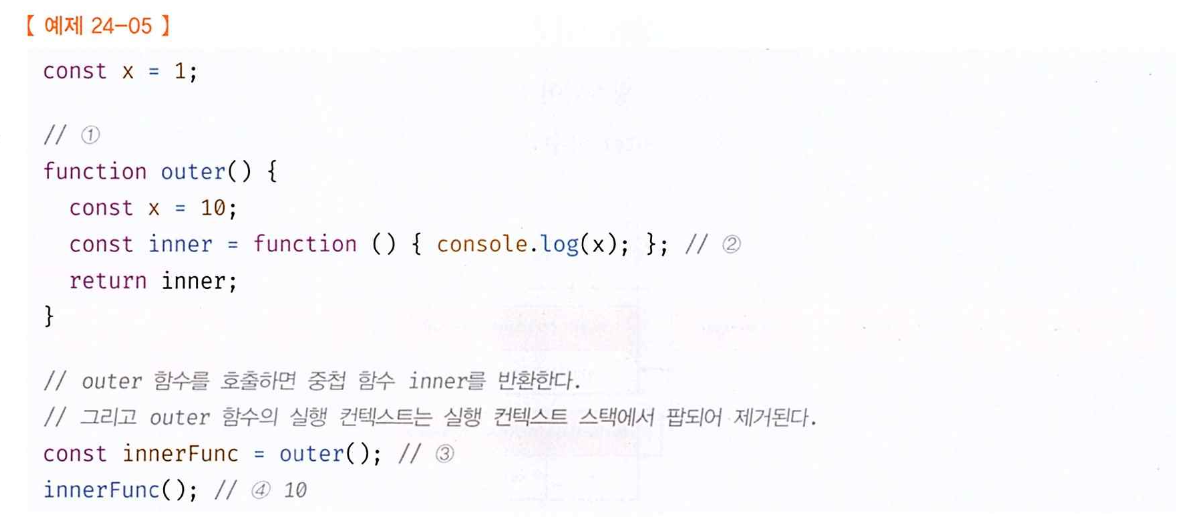 outer 함수가 내부함수 inner를 반환하며 실행이 종료되면 outer함수의 실행 컨텍스트는 실행 컨텍스트 스택에서 제거되지만 outer 함수의 렉시컬 환경까지 소멸하는 것은 아니다.